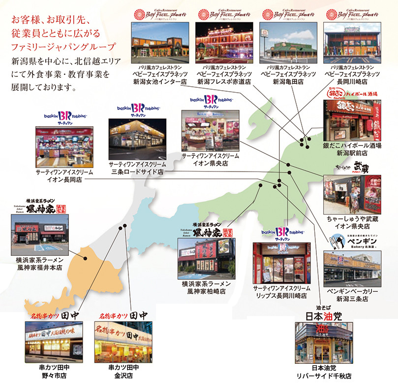 ファミリージャパングループは新潟県を中心に北信越エリアにて外食事業・教育事業を展開しております。